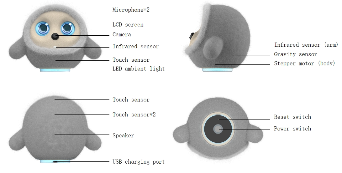 | LCD စကားရပ်မျက်နှာပြင် | 4.28 လက်မ LCD မျက်နှာပြင် (မျက်လုံးများ), dynamic expression display နှင့် binocular display ကိုထောက်ပံ့သည် "Deading" သို့မဟုတ် "သရုပ်ဆောင်ချစ်စရာ") အခါ visual တုံ့ပြန်ချက်။ |
