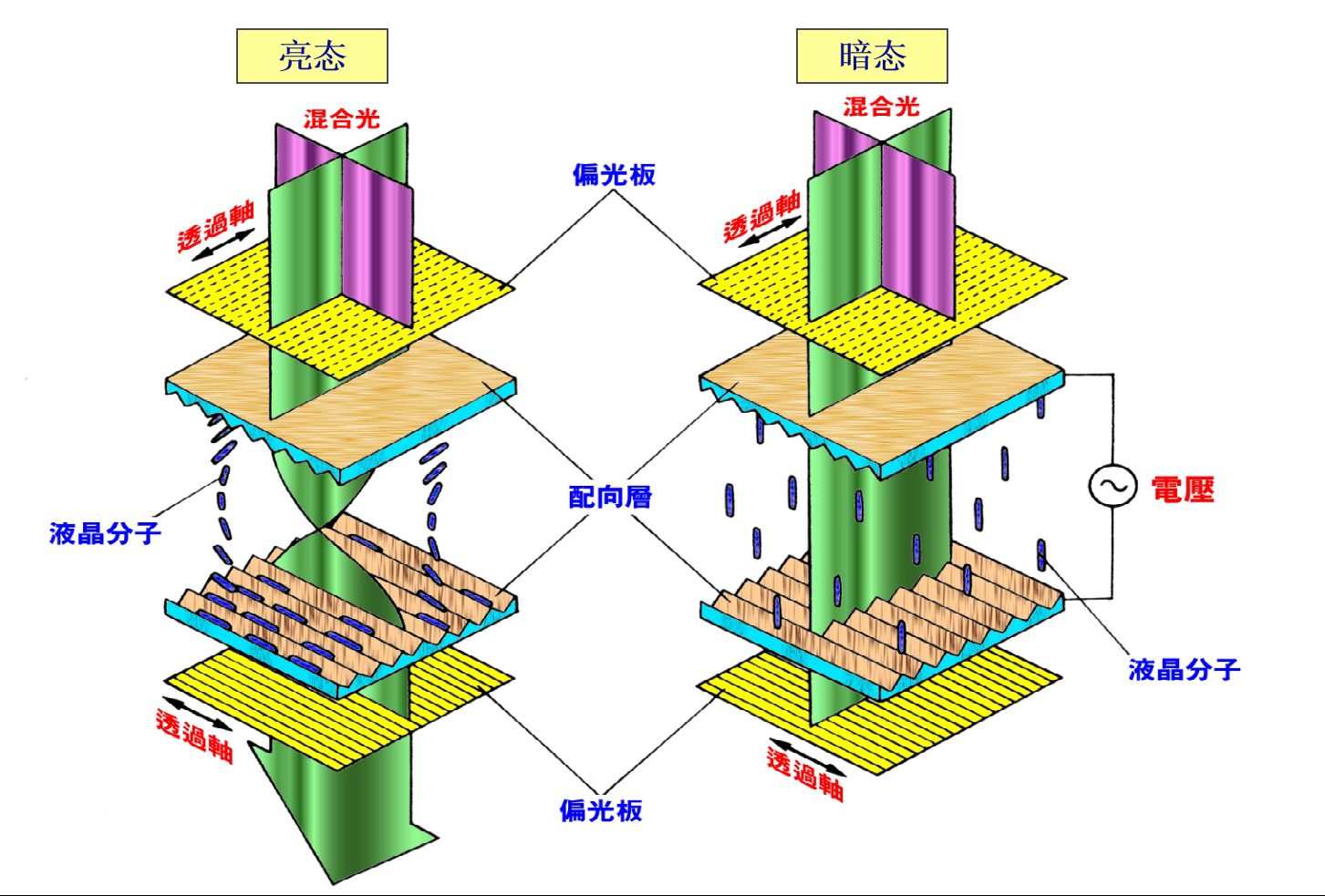 တောက်ပသောအခြေအနေတွင် (display non-display) တွင်အရည်ကြည်လင်မော်လီကျူးများသည်ပုံမှန် 90 ဒီဂရီလိမ်လည်မှုအစီအစဉ်ကိုထိန်းသိမ်းထားသည်။ ရှေ့ polarizer ၏ဂီယာ 0 င်ရိုးကိုဖြတ်သန်းပြီးနောက်အဖြစ်အပျက် Light သည် polarized ဖြစ်လာသည်။ ဤ polarized light သည်အရည်ကြည်လင်အလွှာကိုဖြတ်သန်းသွားသောအခါ၎င်း၏ polarization ည့်သည် ဦး တည်ချက်သည် 90 ဒီဂရီဂိုးသွင်းယူနိုင်ပြီးနောက်ဘက် polarizer ၏ optical axis နှင့် aligning နှင့်တောက်ပသောအခြေအနေကိုဖြစ်ပေါ်စေသည်။
