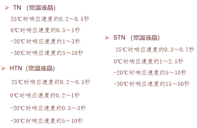 အချိန် (TR) နှင့်ကျဆုံးခြင်းအပါအ 0 င်တုန့်ပြန်မှုမြန်နှုန်း (TF), LCD မျက်နှာပြင်သည် LCD မျက်နှာပြင်ကိုလျင်မြန်စွာတုံ့ပြန်သည်ကိုတိုင်းတာသည်။ အရည် crystals ၏ rheological ဂုဏ်သတ္တိများသည်သူတို့၏ပြင်းထန်သောအပူချိန်မှီခိုမှုများကိုဆုံးဖြတ်သည်။ အပူချိန်အောက်ပိုင်းသည်အပူချိန်နိမ့်ကျပြီးအရည်ကြည်လင်သောအရည်ပျော်မှုပိုမိုများပြားလာသည်။